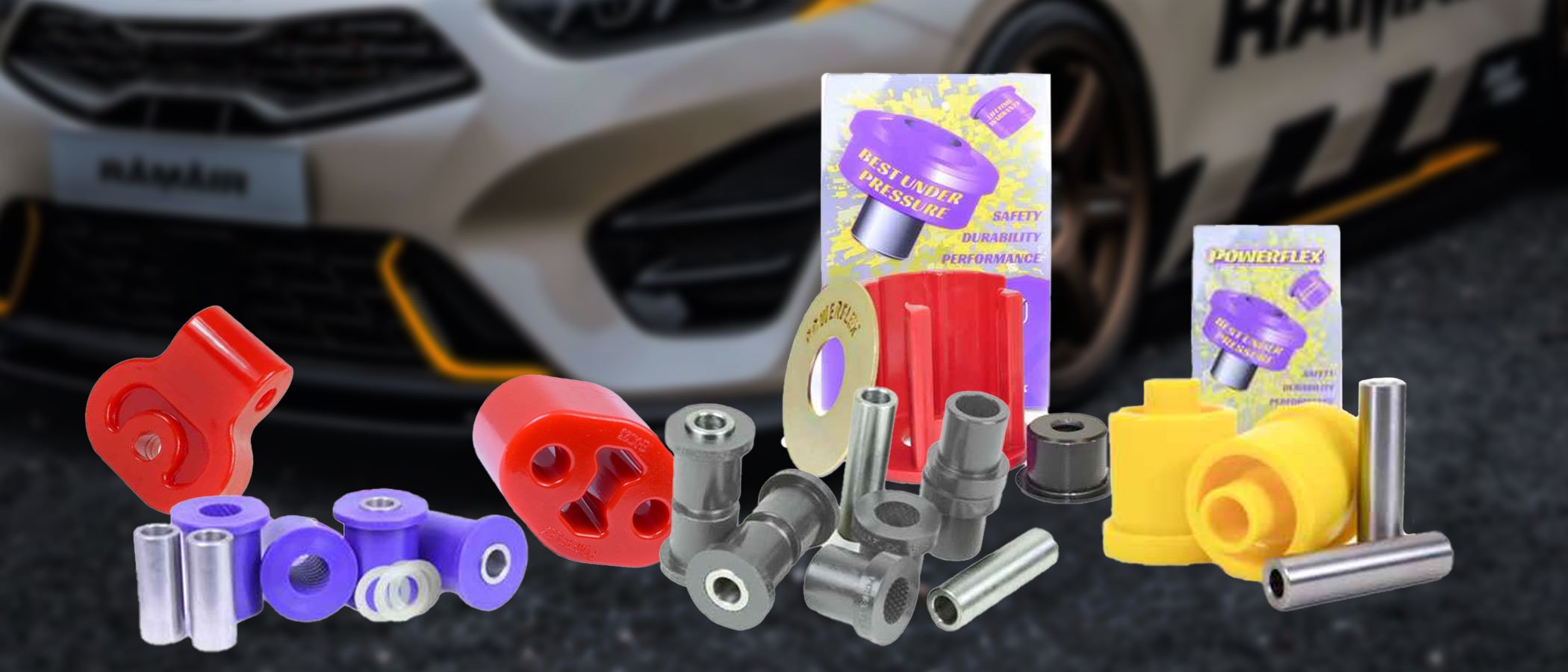 Bei uns findest du Fahrwerksbuchsen, Motorlager, Drehmomentstützen und Auspuff-Gummis von Powerflex. Viele Powerflex-Artikel sind in unterschiedlichen Shore-Härten verfügbar. Die Härte kannst du von der Farbkodierung des Kunststoffes ableiten.